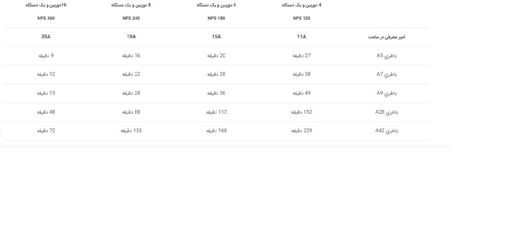 - برای محاسبه مدت زمان نگهداری شارژ، مجموع جریان (آمپر) باطری های متصل شده را به مجموع جریان (آمپر) مصرفی تقسیم کنید. عدد حاصله زمان نگهداری شارژ بر حسب ساعت می باشد.